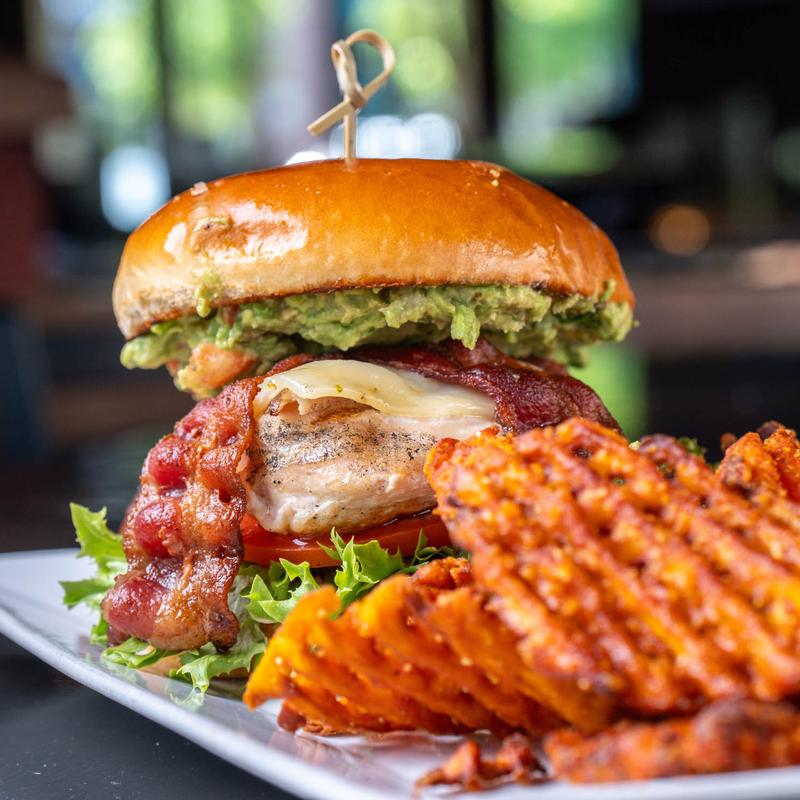 *Grilled chicken breast with bacon, pepper jack, house made guacamole, tomato and lettuce with chili aioli with fries.